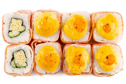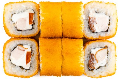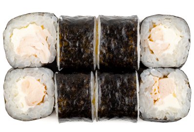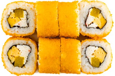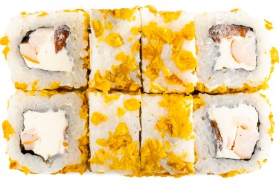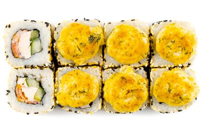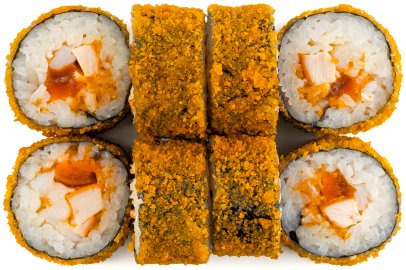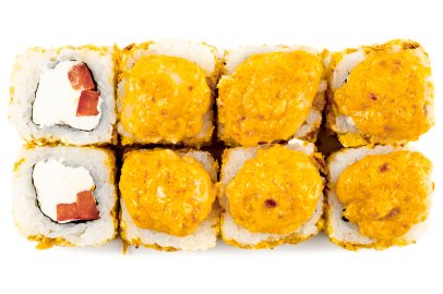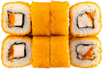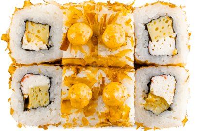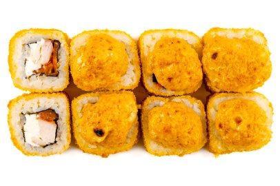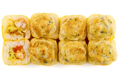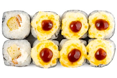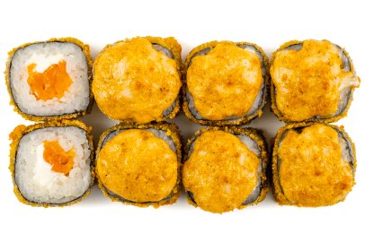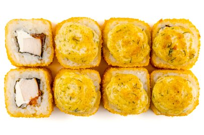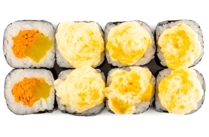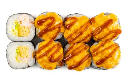 Рис, Маме нори, Сыр плавленный, Сыр сливочный, Курица, Кляр, Шапка (майонез, тобико),