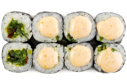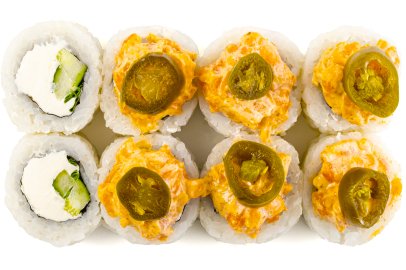Рис, Нори, Сыр сливочный, Огурец, Лук зеленый, Лосось, Спайси соус, Перец Халапеньо,