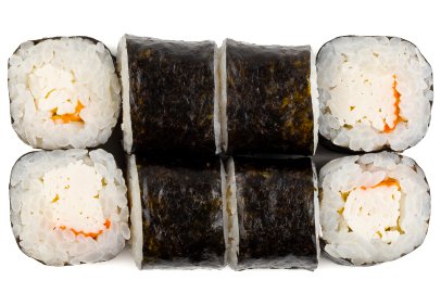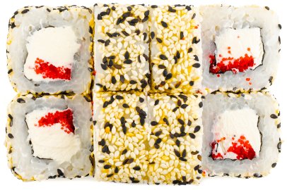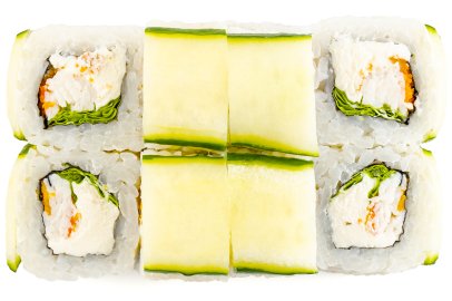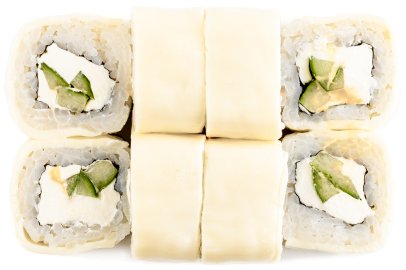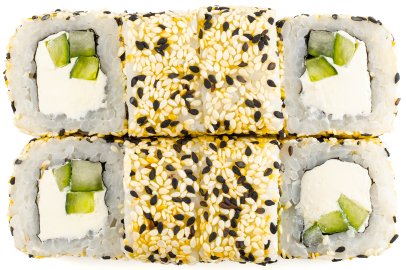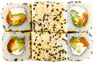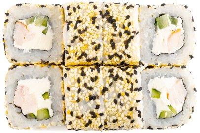 Кунжут, Лист салата, Нори, Огурцы, Перец болгарский , Помидор, Рис, Сыр сливочный, Дайкон,