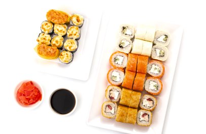 Васаби, имбирь, соевый соус, Филадельфия лайт, Дайкон ролл 1/2, Калифорния с крабом 1/2, Классика с огурцом, Классика с курицей и соусом (сверху),