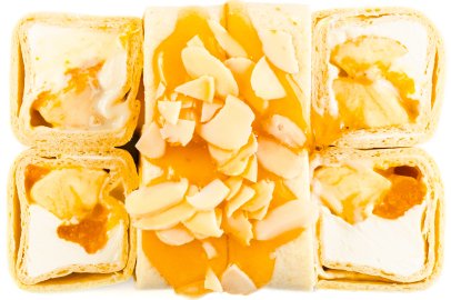 Тортилья, Манго, Банан, Топпинг, Миндаль лепестки, Сгущенное молоко, Сыр сливочный,