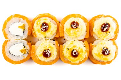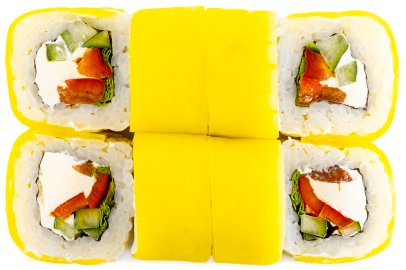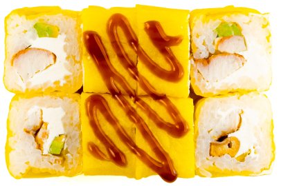 Лосось, Нори, Рис, Сыр сливочный, Унаги соус, Фирменный соус, Манго,