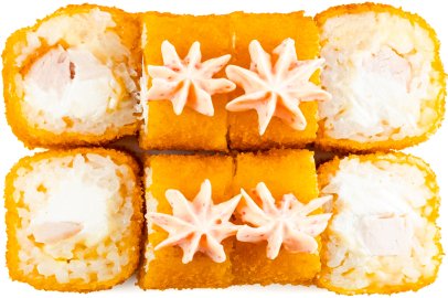 Рис, нори, курица, сыр сливочный, кляр, соус Пеппа (моцарелла, бекон, майонез, соус ББК),
