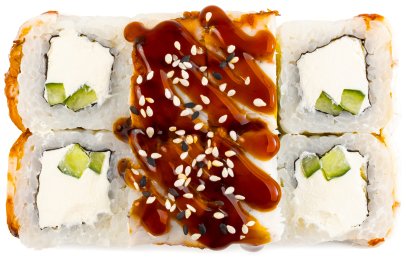 Рис, Нори, Огурец, Сыр сливочный, Снежный краб, Шапка (майонез, тобико), Соус Унаги,