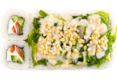 Рис, Нори, Сливочный сыр, Огурец, Болгарский перец, Арахис, Лист Салата, Соус Ореховый, Чука,