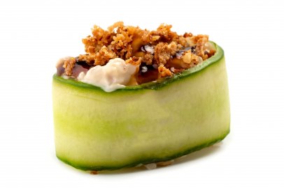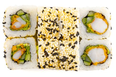 Рис, Нори, Майонез, Огурец, Креветка темпура, Кунжут, Соус Терияки, Лист салата,