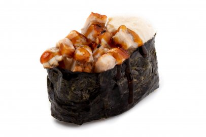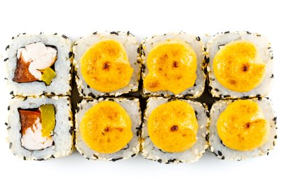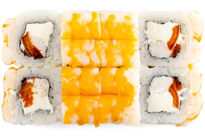 Рис, Нори, Омлет Тамаго, Сыр сливочный, Угорь, Шапка (моцарелла, майонез, чеснок), Соус Унаги,