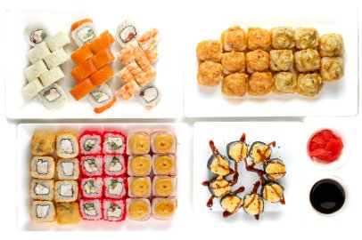 Васаби, имбирь, соевый соус, Филадельфия лайт, Дайкон ролл 1/2, Калифорния с крабом 1/2, Классика с огурцом, Классика с курицей и соусом (сверху),