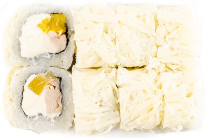 Рис, Маме нори, Сыр плавленный, Сыр сливочный, Курица, Кляр, Шапка (майонез, тобико),